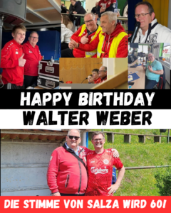 Seinen 60. Geburtstag feiert heute Walter Weber – eine Persönlichkeit, die aus dem Vereinsleben der FSG 99 Salza nicht wegzudenken ist. Seit gefühlt einer Ewigkeit prägt er als Stadionsprecher die Heimspiele der FSG und verleiht dem Salzaer Stadion mit seiner Stimme, seinem Humor und seinem Gespür für den Moment eine ganz besondere Atmosphäre.